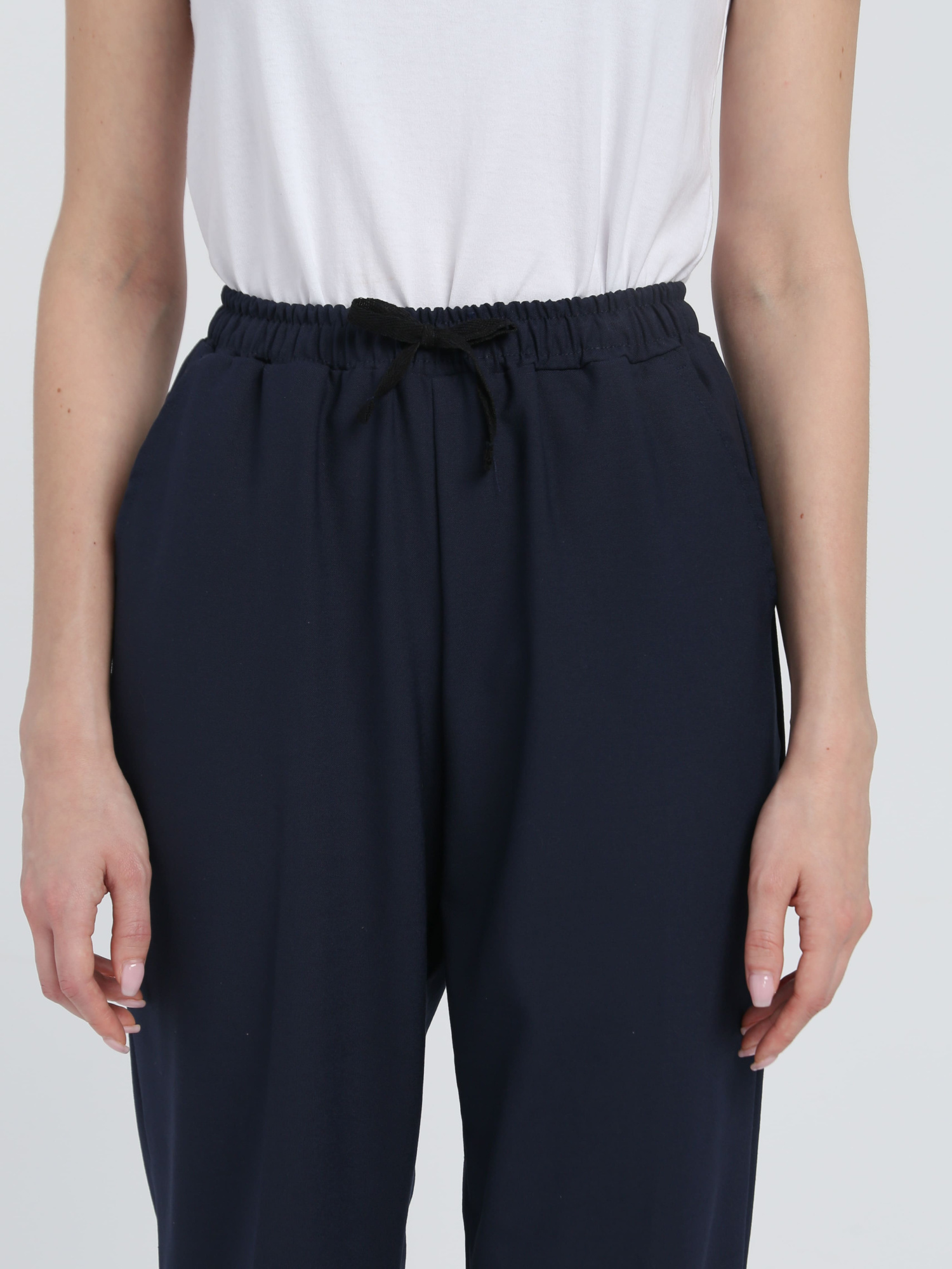 Верхний срез брюк обработан притачным поясом с эластичной тесьмой . Низ брюк обработан швом вподгибку с закрытым срезом