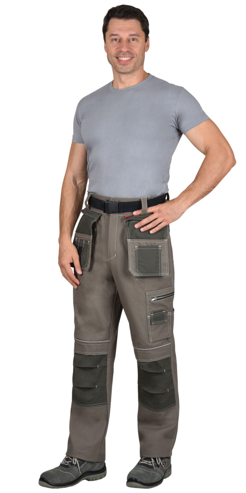 Брюки выполнены из ткани "Канвас Комфорт", прямого силуэта, с притачным поясом, с застежкой гульфика на тесьму – «молния», с различными многофункциональными карманами и объёмными наколенниками. В брюках предусмотрен ремень из резинки ременной «Сириус» застегивающийся на защелку-фастекс.