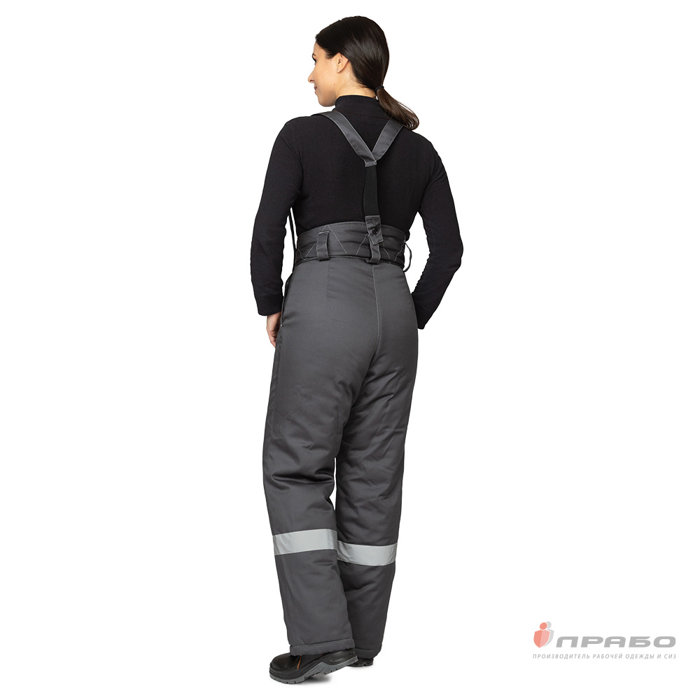 Брюки: прямые, с притачной утеплённой подкладкой, с центральной застёжкой гульфик на молнию. Притачной утеплённый пояс, более широкий на спинке, застёгивается на 2 пуговицы. На поясе пять шлёвок. Бретели пристёгиваются к поясу на пуговицы, со стороны спинки бретели выполнены частично с открытой эластичной лентой. Задние половинки с вытачками на талии обеспечивают силуэтную посадку.