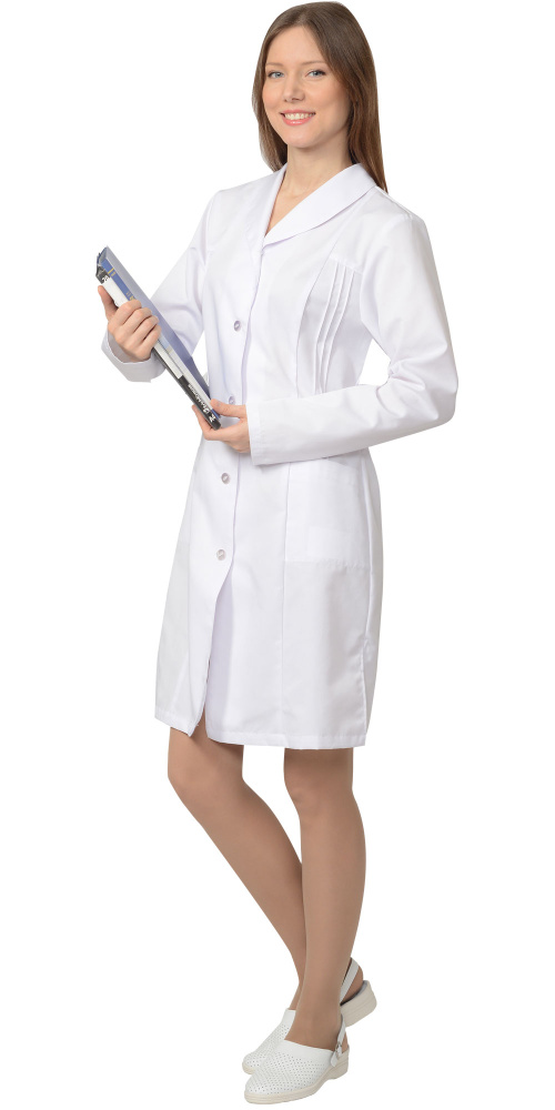 Халат женский, полуприлегающего силуэта, с центральной бортовой застёжкой на 5 петель и пуговиц, шалевым воротником, с кокетками на полочках и с рельефными швами на полочках и спинке, с нижними накладными карманами, с разрезами в боковых швах. Рукава втачные длинные.