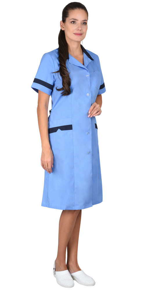 Халат женский укороченный, полуприлегающего силуэта, с центральной застежкой на пуговицы, с рельефными швами, с одним верхним и двумя нижними накладными карманами, воротник отложной. По талии в шлевках продет пояс.