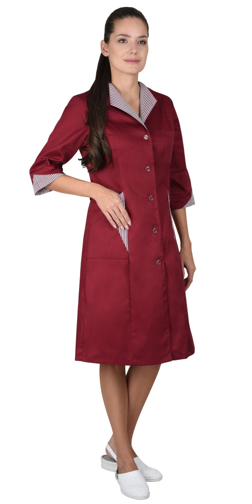 Халат полуприлегающего силуэта, слегка расширенный к низу. Застёжка на пуговицы, рельефы. Воротник, часть нижних карманов и низ рукавов 3/4 из отделочной ткани.