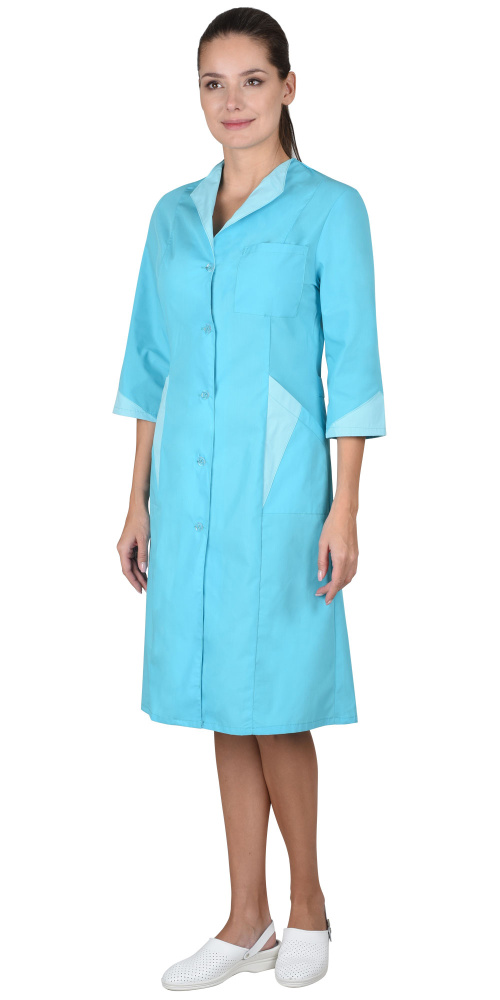 Халат полуприлегающего силуэта, слегка расширенный к низу. Застёжка на пуговицы, рельефы. Воротник, часть нижних карманов и низ рукавов 3/4 из отделочной ткани.