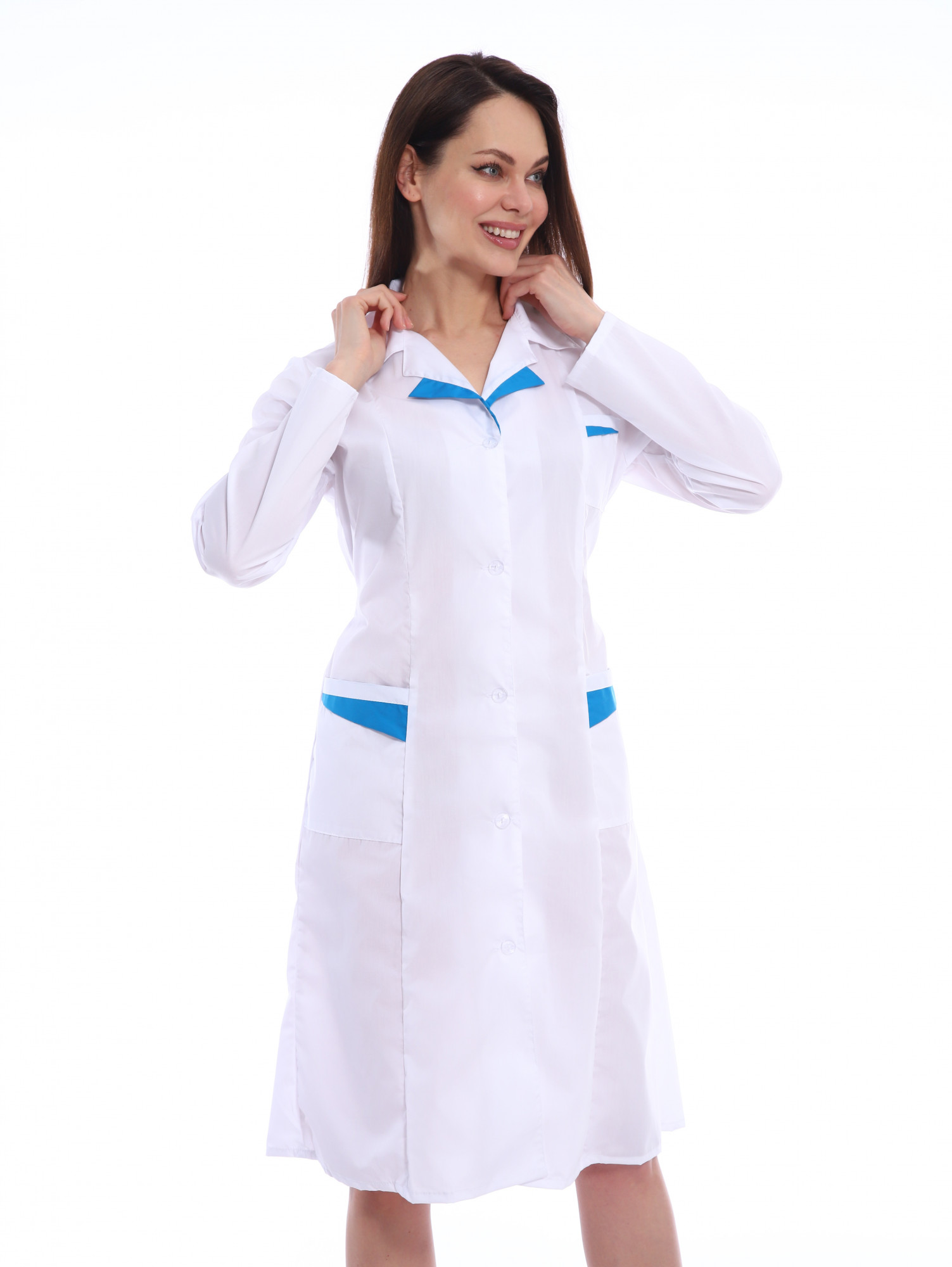 Халат женский с фигурной отделкой на лацканах и карманах, застежка на пуговицах, вертикальные рельефы. Ширина по линии талии регулируется хлястиком.