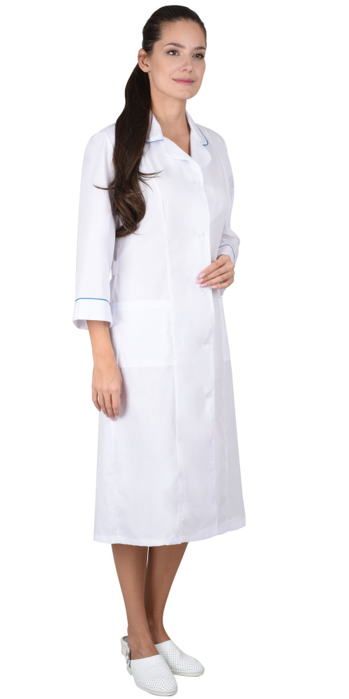 Халат с отложным воротником и нижними накладными карманами, по вороту и манжетам рукавов отделка в виде канта контрастного цвета. Рукава 3/4. Цвет отделки: Бирюзовый.
