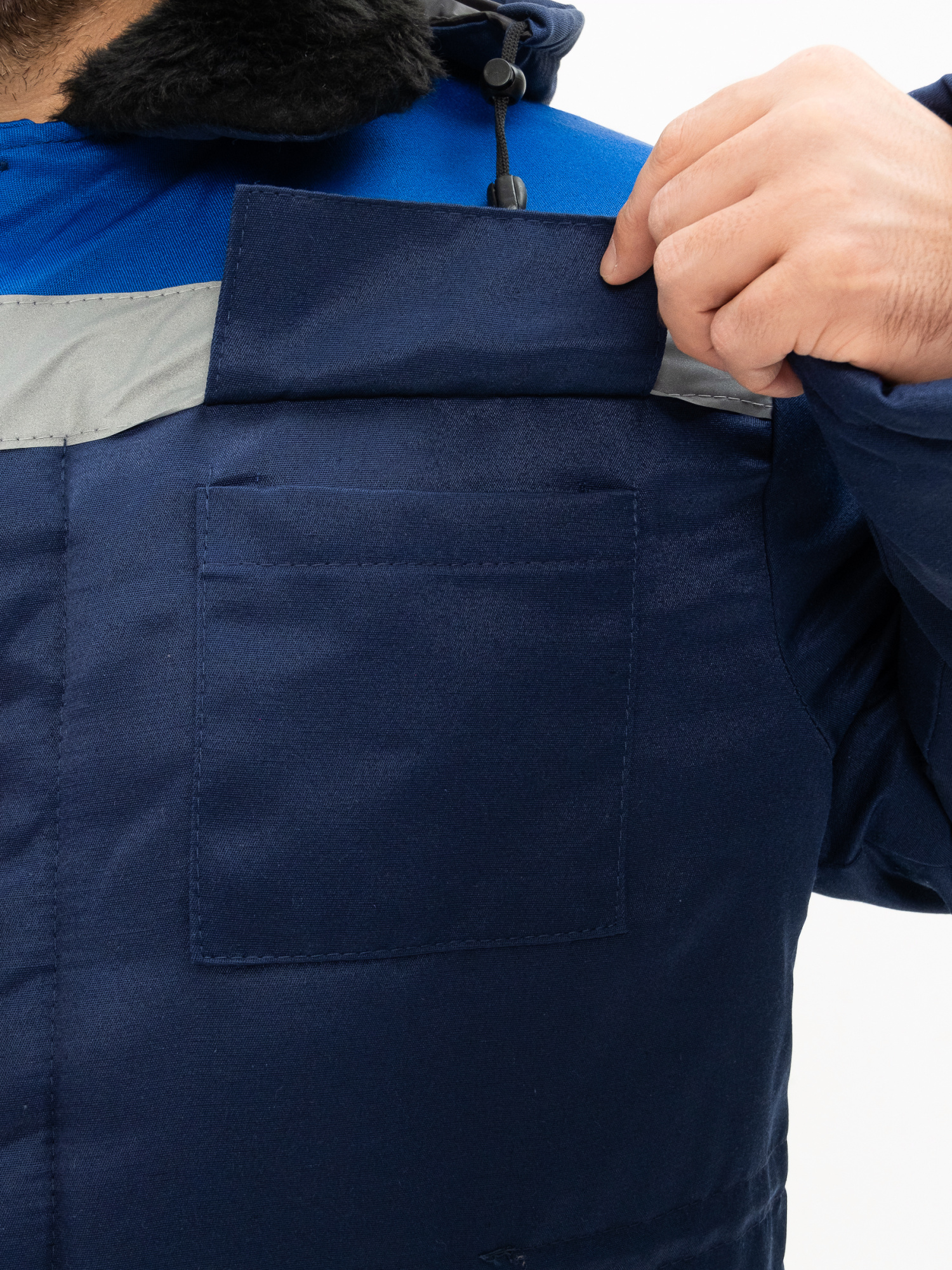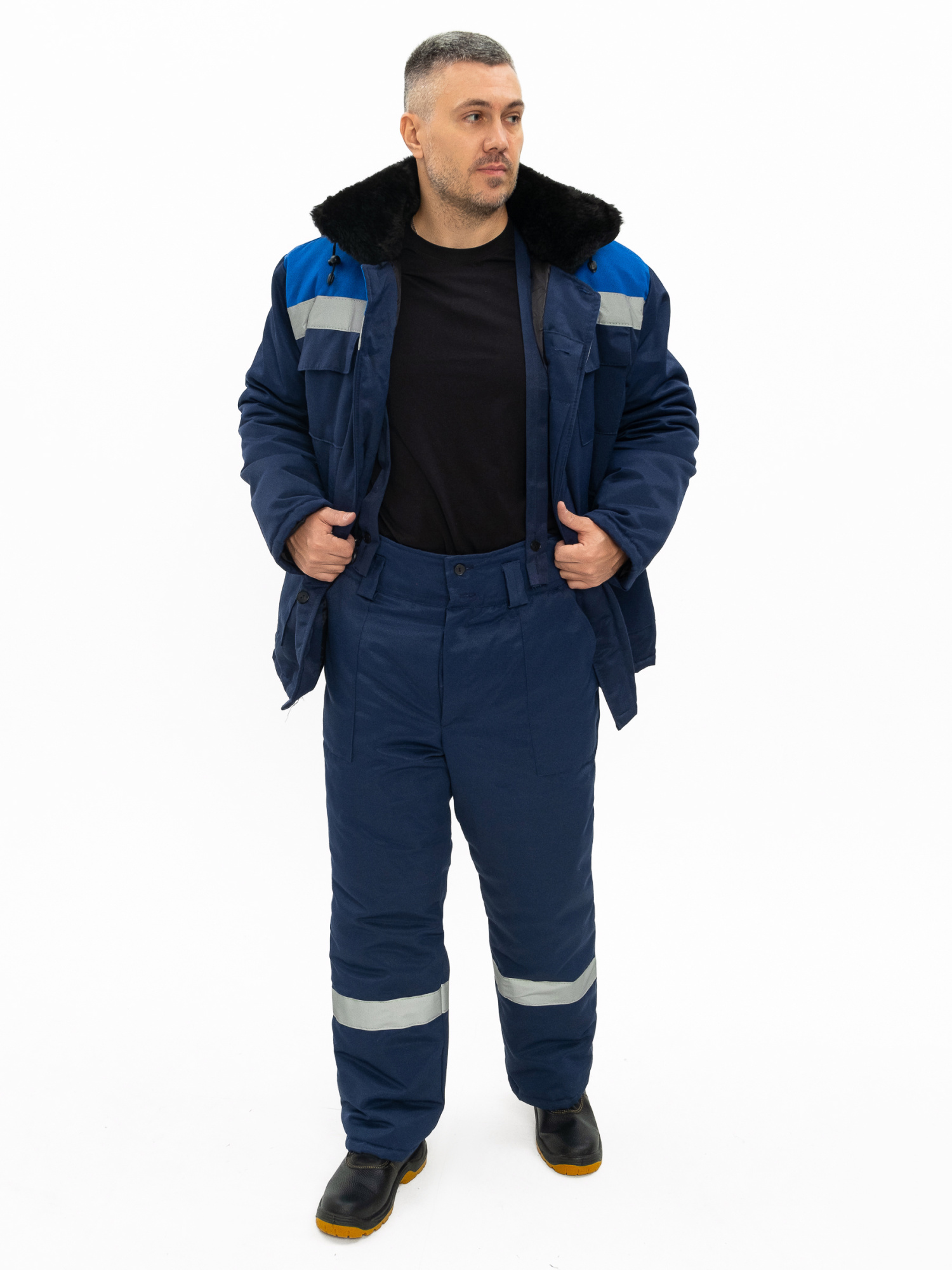 Костюм состоит из куртки и брюк. Куртка прямого силуэта с кокеткой из контрастной отделочной ткани со светоотражающей полосой 50мм. Центральная супатная застежка на петли и пуговицы. Имеется регулируемая кулиска по линии талии, удобные накладные боковые карманы и нагрудные карманы. Отстегивающийся капюшон на пуговицах, меховой воротник. Брюки прямые, с накладными карманами, на притачной утеплённой подкладке, с застёжкой гульфика на молнию. Брюки с широким притачным поясом с застежкой на петли и пуговицы, с бретелями. Бретели съемные, пристегиваются к брюкам при помощи пуговиц и петель, регулируются защелками-фастексами.