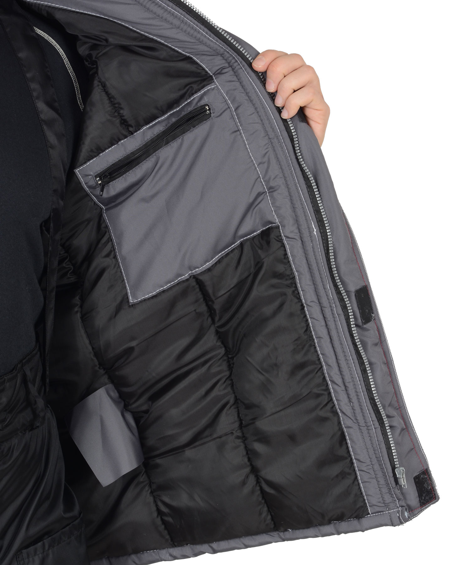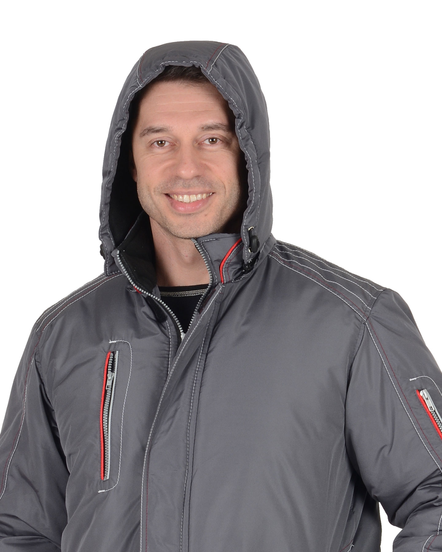 Куртка длинная, прямого силуэта, с притачной утепл.нной подкладкой и пристегивающимся капюшоном; воротником-стойкой; с кокеткой расстрочной нитками контрастного цвета; ветрозащитной планкой застегивающиеся на ленту «контакт»; подпланкой; с центральной заст.жкой на тесьму - «молния»; с верхним прорезными карманом с правой стороны на тесьму – «молния»; с нижними прорезными карманами в листочку; рукава втачные с манжетами частично стянутыми на резинку, на левом рукаве выполнен карман на тесьму – «молния», с внутренним карманом на тесьму – «молния». В куртке вшивается бордовый и СВ кант
