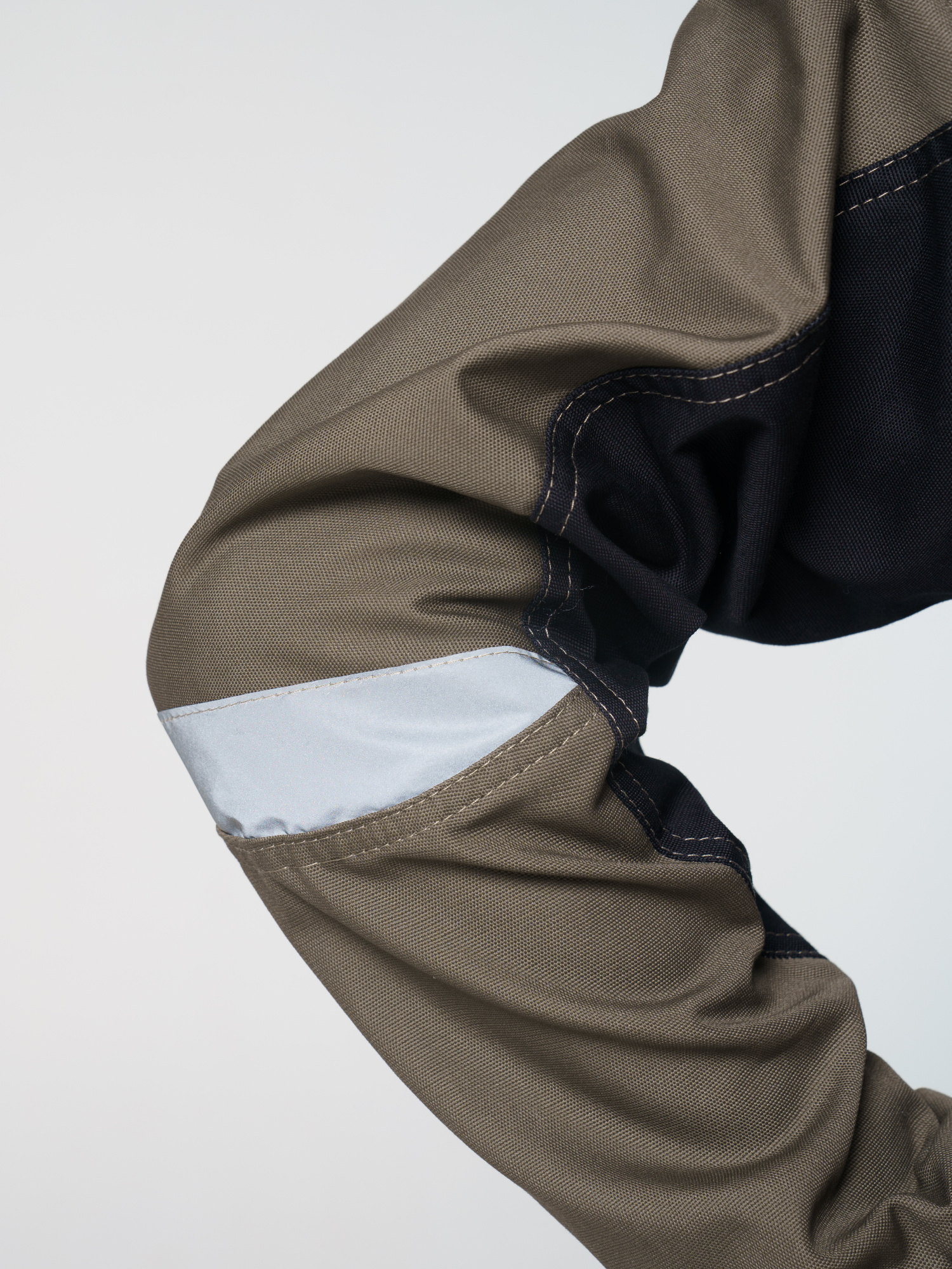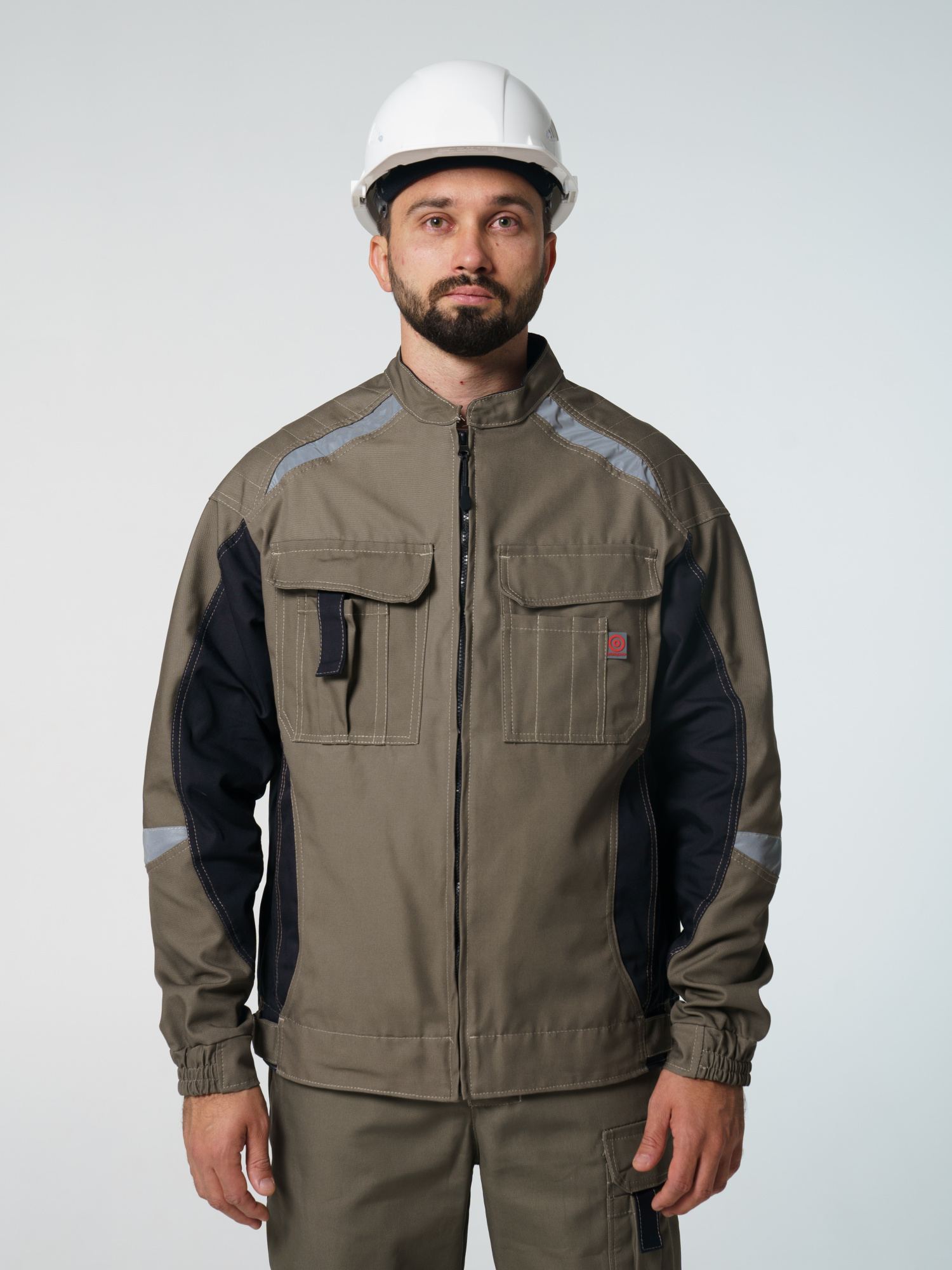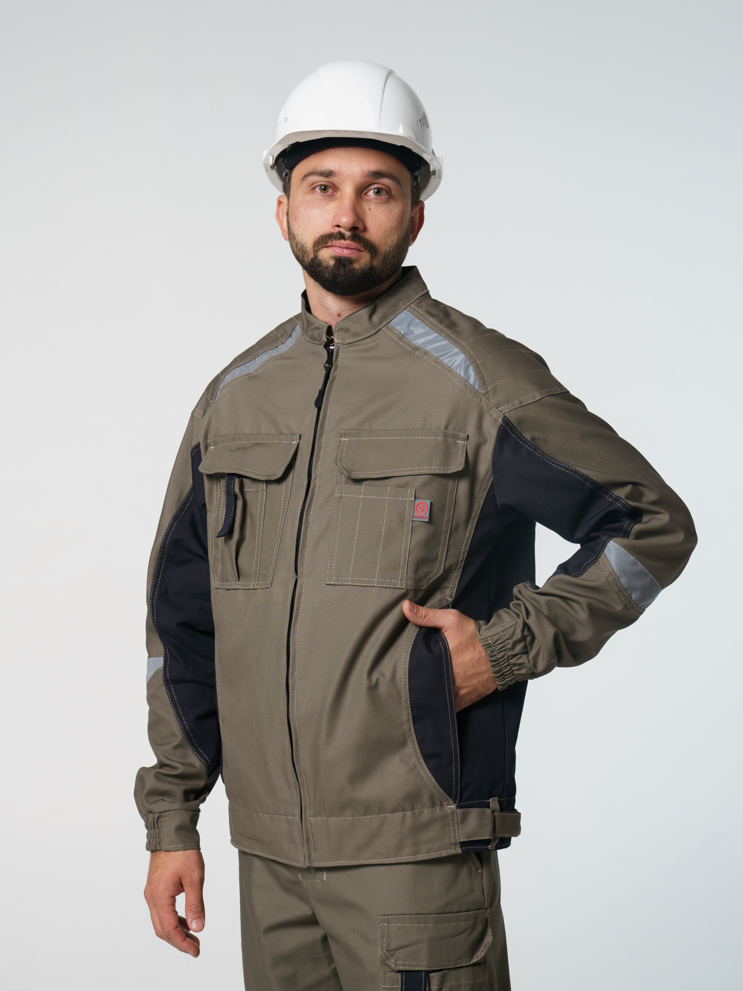 Куртка прямого силуэта; короткая; воротник стойка; с центральной застёжкой на молнию; с верхними фигурными карманами с фигурными клапанами; низ регулируется при помощи хлястиков с полукольцами. На куртке есть СВ элементы.