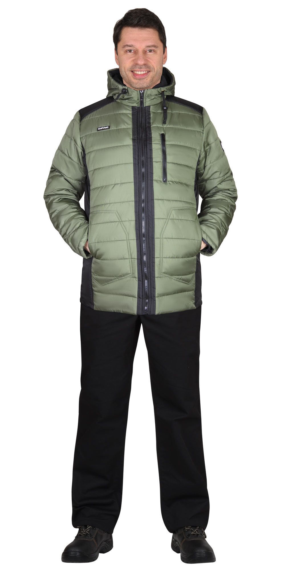 Куртка комбинированная из ткани двух цветов, с центральной застежкой на молнию, с удлиненной фигурной линией низа по спинке, с втачным капюшоном, с втачными рукавами. Куртка с левым нагрудным прорезным карманом на молнию, нижние карманы в швах. На подкладке с правой стороны накладной карман на молнию.