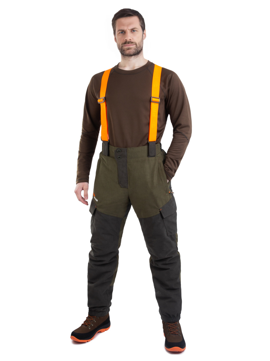 Брюки на широком поясе со шлевками для ремня. Съемные подтяжки. 4 кармана. 2 на влагозащитных молниях в верхней части брюк и 2 объемных в области бедер. Эластичные кулисы под коленом и низу брюк для защиты от проникновения холодного воздуха.