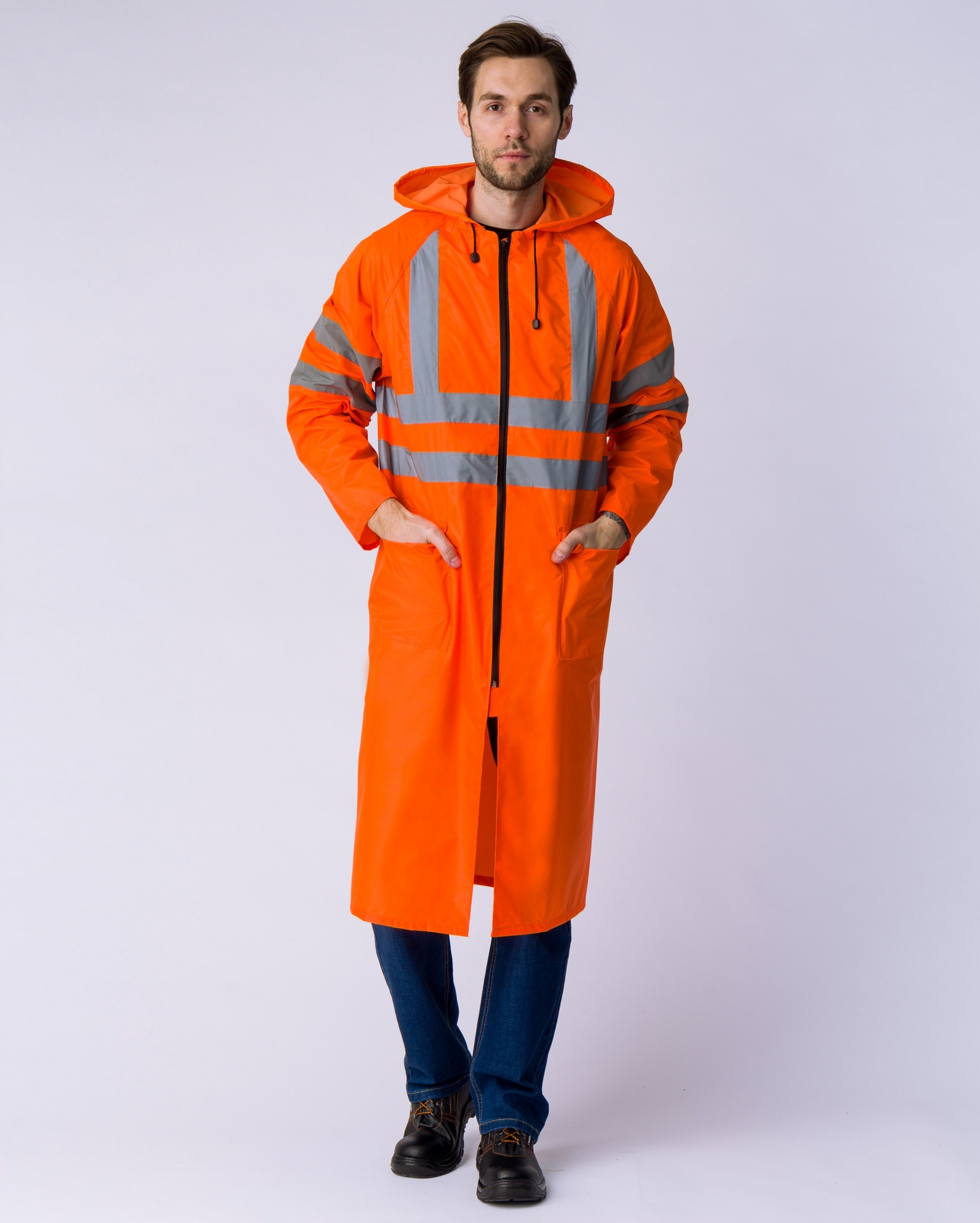 Влагозащитный плащ повышенной видимости с капюшоном и двумя карманами с клапанами.