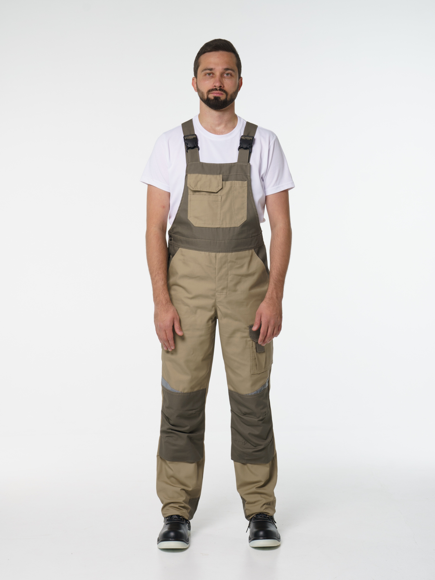 Полукомбинезон с застёжкой гульфика на молнию и застёжкой в боковом шве на пуговицы; с различными многофункциональными карманами; с объемными наколенниками. В полукомбинезоне предусмотрена лента светоотражающая (мелкодисперсная белая)  фигурной формы.